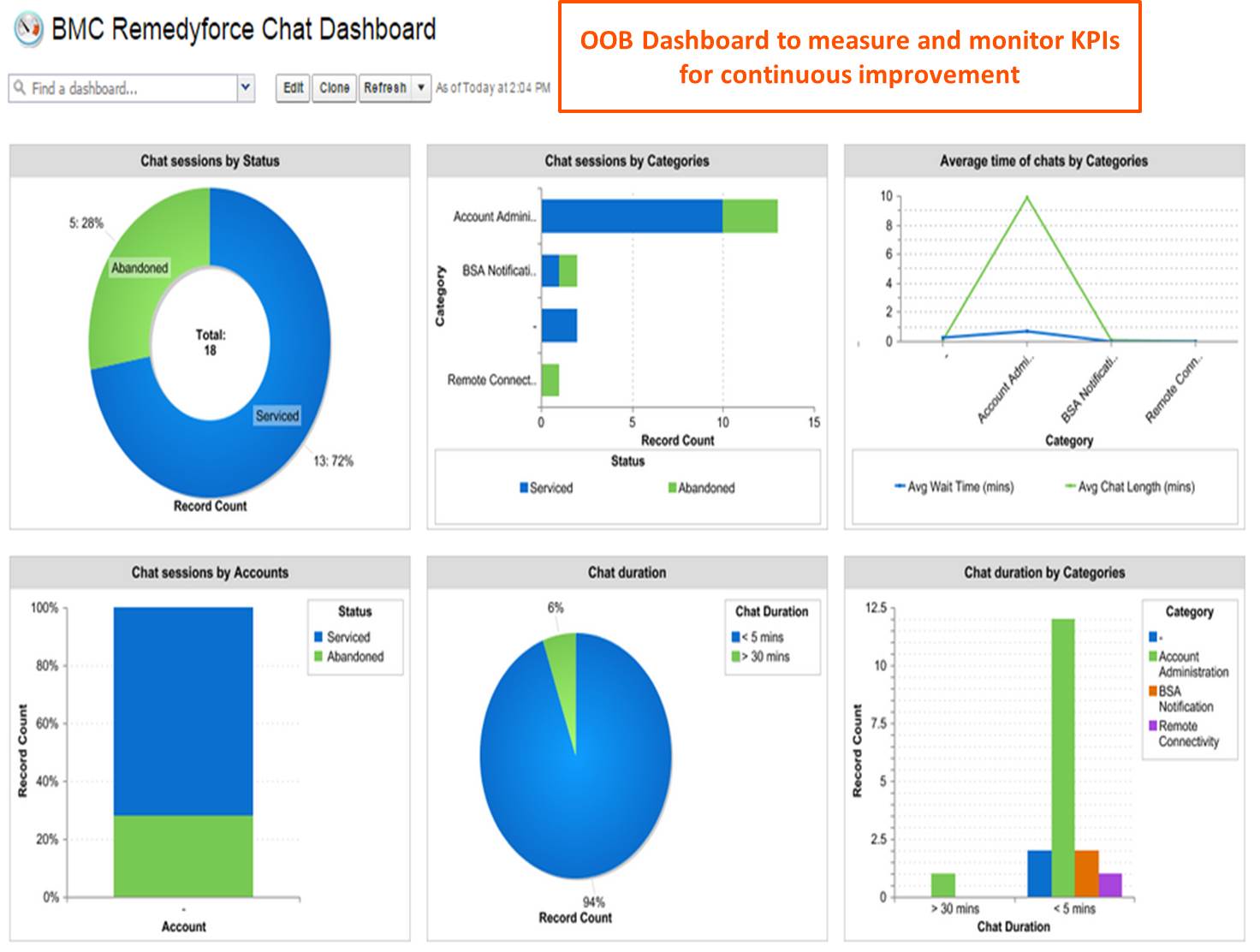 Clearly, what Remedyforce Chat offers is an opportunity for our customers’ help desks to provide a full featured service desk of voice, email, self-service, AND chat with the goal cost reduction and improved customer satisfaction. Remedyforce Chat even offers a Chat Dashboard that allows organizations to identify if users are leaving before they are assisted, to review chat duration to understand staff involvement and conversation length, and to identify categories having higher abandon rates.